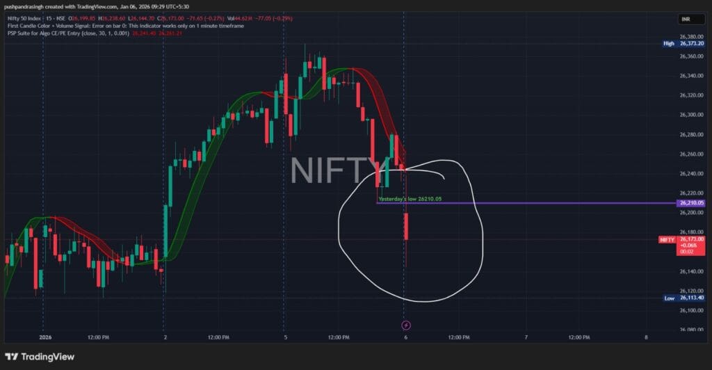 નિફ્ટીએ ગઈકાલના નીચા સ્તરે પહોંચી ગયા, જેનો અર્થ એ કે બેયર બજાર પર તેમની પકડ મજબૂત કરી રહ્યા છે. ગઈકાલનો નીચો સ્તર 26210 હતો.