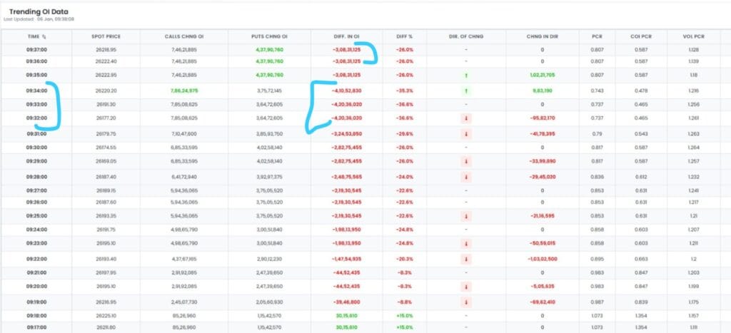 મોટા પૈસાવાળા ખેલાડીઓએ નિફ્ટીમાં દિવસનો પહેલો ટ્રેપ ગોઠવ્યો છે. નકારાત્મક 4.25 કરોડ (4.25 કરોડ) સુધી પહોંચ્યા પછી, OI માં તફાવત હવે અચાનક 1 કરોડનો ઘટાડો કરવામાં આવ્યો છે. પરિણામે, તે ઘટીને લગભગ 3.8 કરોડ (3.8 કરોડ) થઈ ગયો છે, જેના કારણે નિફ્ટીમાં થોડો ઘટાડો થયો છે.