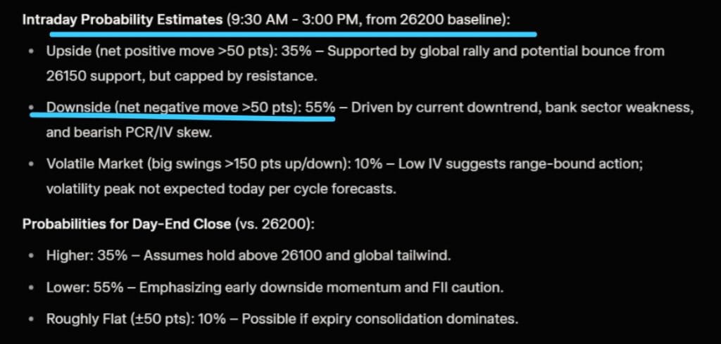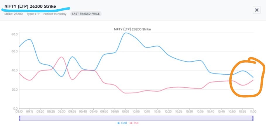 નિફ્ટી 26200 સ્ટ્રાઈક પર કોલ અને પુટ ક્રોસઓવર નજીક છે. કોલ લાઇન પુટ લાઇનને પાર કરીને નીચે તરફ જવાની અપેક્ષા છે. એકવાર આવું થાય અને લગભગ 10-15 મિનિટ સુધી ચાલુ રહે, તો બાકીના દિવસ માટે નિફ્ટીનો નીચે તરફનો ટ્રેન્ડ પુષ્ટિ પામે તેવી શક્યતા છે.