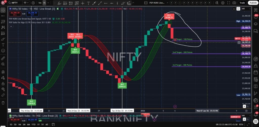 આ સૂચકે સોમવાર, 5 જાન્યુઆરી, 2026 ના રોજ બપોરે 12:15 વાગ્યે 26308.75 પર વેચાણ સંકેત જારી કર્યો. આ સ્તર નિફ્ટી માટે ત્રણ ઘટાડા લક્ષ્યો બનાવે છે.