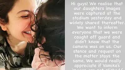 અનુષ્કા શર્માએ તેની ઈન્સ્ટાગ્રામ સ્ટોરી પર એક પોસ્ટ લખી છે, જેમાં તેણે દીકરીની વાયરલ તસવીરનો ઉલ્લેખ કર્યો છે, તેની સાથે તે નથી ઈચ્છતી કે તેની દીકરીની તસવીર મીડિયા પર આવે. તેણે ઈન્સ્ટાગ્રામ સ્ટોરી પર લખ્યું કે, હેલો મિત્રો, મને સમજાયું કે ગઈકાલની મેચ દરમિયાન મારી તસવીર સ્ટેડિયમમાંથી લેવામાં આવી હતી અને દરેક જગ્યાએ શેર કરવામાં આવી હતી. હું તમને બધાને કહેવા માંગુ છું કે આ તસવીરો અમારી જાણ વગર બહાર આવી છે. મને ખબર નહોતી કે અહીં કેમેરામેન છે. મારું સ્ટેન્ડ અને અપીલ પહેલા જેવી જ છે. જો વામિકાની તસવીર ક્લિક અથવા શેર કરવામાં ન આવે તો અમે ખૂબ આભારી રહીશું. તેની પાછળનું કારણ અમે પહેલા જ જણાવી ચૂક્યા છીએ. આભાર