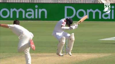Karunaratne cops a bouncer from Cummins and has to be stretchered off after lengthy treatment on the field.