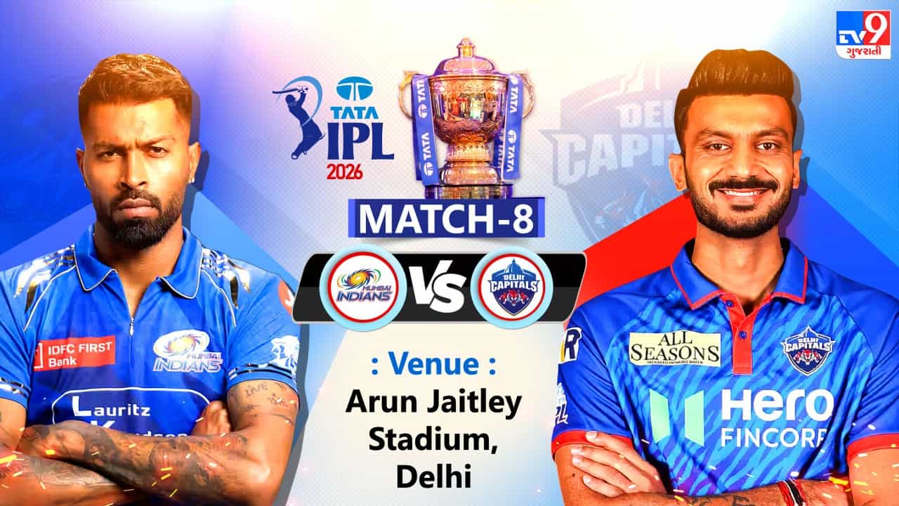 IPL 2026માં આજે ડબલ હેડર મુકાબલા યોજાશે. આજની પહેલી અને સિઝનની આઠમી મેચમાં દિલ્હી કેપિટલ્સ અને મુંબઈ ઈન્ડિયન્સ વચ્ચે મુકાબલો યોજાઈ રહ્યો છે. મેચ પહેલા બંને ટીમના કેપ્ટનો વચ્ચે ટોસ થયો હતો, જેમાં DCએ ટોસ જીતી બોલિંગ પસંદ કરી, એટલે કે MI આ મેચમાં પહેલા બેટિંગ કરશે. બંને ટીમોની આ સિઝનની બીજી મેચ છે અને બંને ટીમો જીતવા પ્રયાસ કરશે.