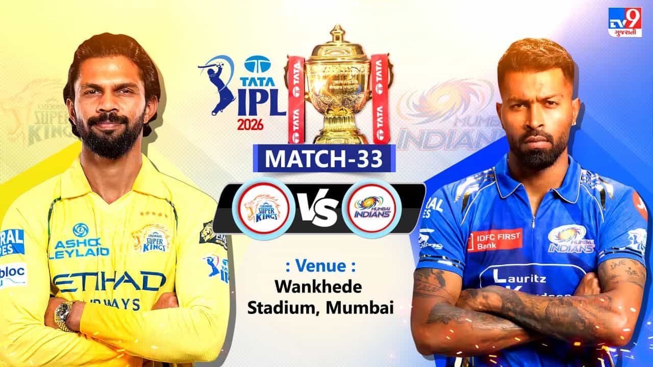 IPL 2026માં આજે સિઝનના 33 મા મુકાબલામાં મુંબઈ ઈન્ડિયન્સ અને ચેન્નાઈ સુપર કિંગ્સ વચ્ચે મુકાબલો યોજાઈ રહ્યો છે. મેચ પહેલા બંને ટીમના કેપ્ટનો વચ્ચે ટોસ થયો હતો, જેમાં MIએ ટોસ જીતી બોલિંગ પસંદ કરી, એટલે કે CSK આ મેચમાં પહેલા બેટિંગ કરશે. CSK અને MI બંને આ સિઝનની સાતમી મેચ રમી રહી છે. બંને ટીમો મેચ જીતવા પ્રયાસ કરશે.
