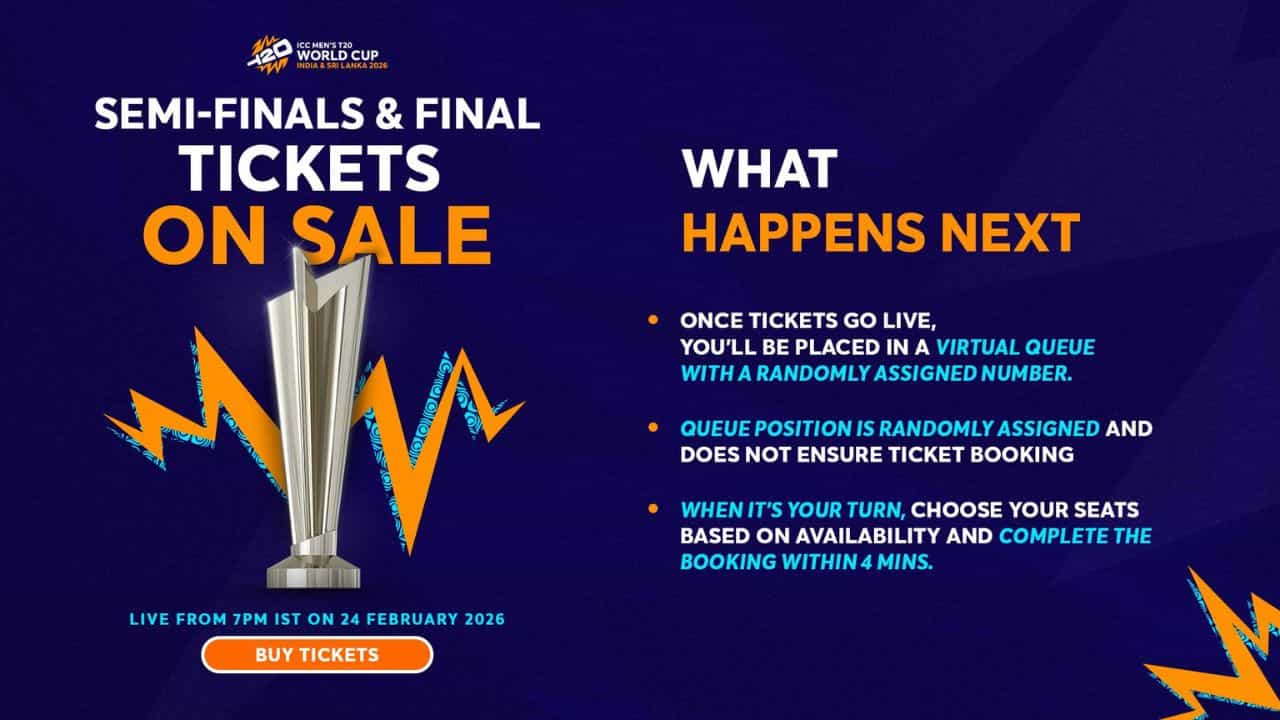 The tickets for the semi-finals and final of the ICC Men’s #T20WorldCup 2026 go live today, 24 February at 7 PM IST ⏰