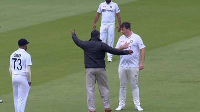 લોર્ડઝ (Lords Test)માં હાલમાં ભારત અને ઈંગ્લેન્ડ (India vs England) વચ્ચે બીજી ટેસ્ટ મેચ રમાઈ રહી છે. ત્રીજા દિવસની રમત દરમ્યાન ભારતીય ટીમે પ્રથમ સેશનથી અંતિમ સેશન સુધી બોલીંગ કરવાનું નસીબ રહ્યું હતુ. ભારતીય બોલરો વિકેટની શોધમાં દિવસભરની રમત દરમ્યાન બોલીંગ કરતા રહ્યા હતા. પરંતુ ખાસ સફળતાઓ ભારતીય બોલરોને મળી નહોતી. આ દરમ્યાન એક શખ્શ ભારતીય ખેલાડીઓ જેવી અદ્દલ ટી શર્ટ પહેરીને મેદાનમાં ઘૂસી આવ્યો હતો. અચાનકથી આ અજાણ્યા યુવકની મેદાનમાં આ હરકતથી સૌનુ ધ્યાન તેની તરફ ખેંચાયુ હતુ.