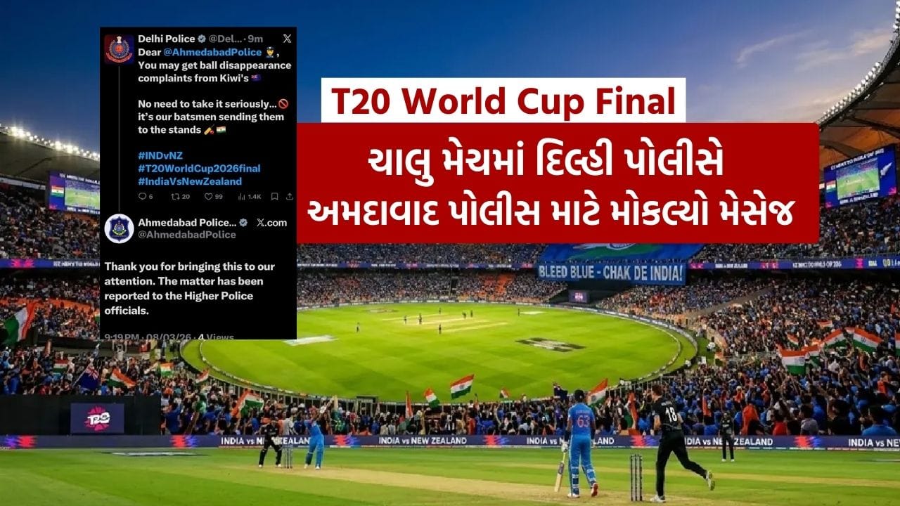 અમદાવાદના નરેન્દ્ર મોદી સ્ટેડિયમમાં ચાલી રહેલી T20 વર્લ્ડ કપ ફાઇનલ દરમિયાન મેદાનમાં જેટલી જ રોમાંચક રમત જોવા મળી રહી હતી, એટલી જ મજા સોશિયલ મીડિયામાં પણ જોવા મળી. ભારત અને ન્યુઝીલેન્ડ વચ્ચે ચાલી રહેલી આ મહત્વપૂર્ણ મેચ દરમિયાન દિલ્હી પોલીસે અમદાવાદ પોલીસને ટેગ કરીને એક મજેદાર ટ્વિટ કરી, જે સોશિયલ મીડિયામાં ઝડપથી વાયરલ થઈ ગઈ.