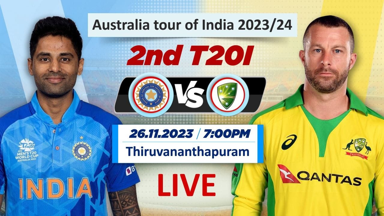 IND vs AUS live score : વર્લ્ડ કપ 2023 બાદ ભારત અને ઓસ્ટ્રેલિયા વચ્ચે પાંચ મેચની T20 સીરિઝ શરૂ થઈ હતી, જેનો બીજો મુકાબલો રવિવારે તિરુવનંતપુરમમાં સાંજે 7 વાગ્યેથી શરૂ થશે. સાંજે 6:30 વાગ્યે બંને ટીમના કપ્તાનો વચ્ચે ટોસ યોજાશે. આજની મેચમાં જીત મેળવી સીરિઝમાં કમબેક કરવા ઓસ્ટ્રેલિયા પ્રયાસ કરશે. જ્યારે ભારત બે મેચ જીતી સિરીઝમાં 2-0ની સરસાઈ મેળવવા પ્રયાસ કરશે.