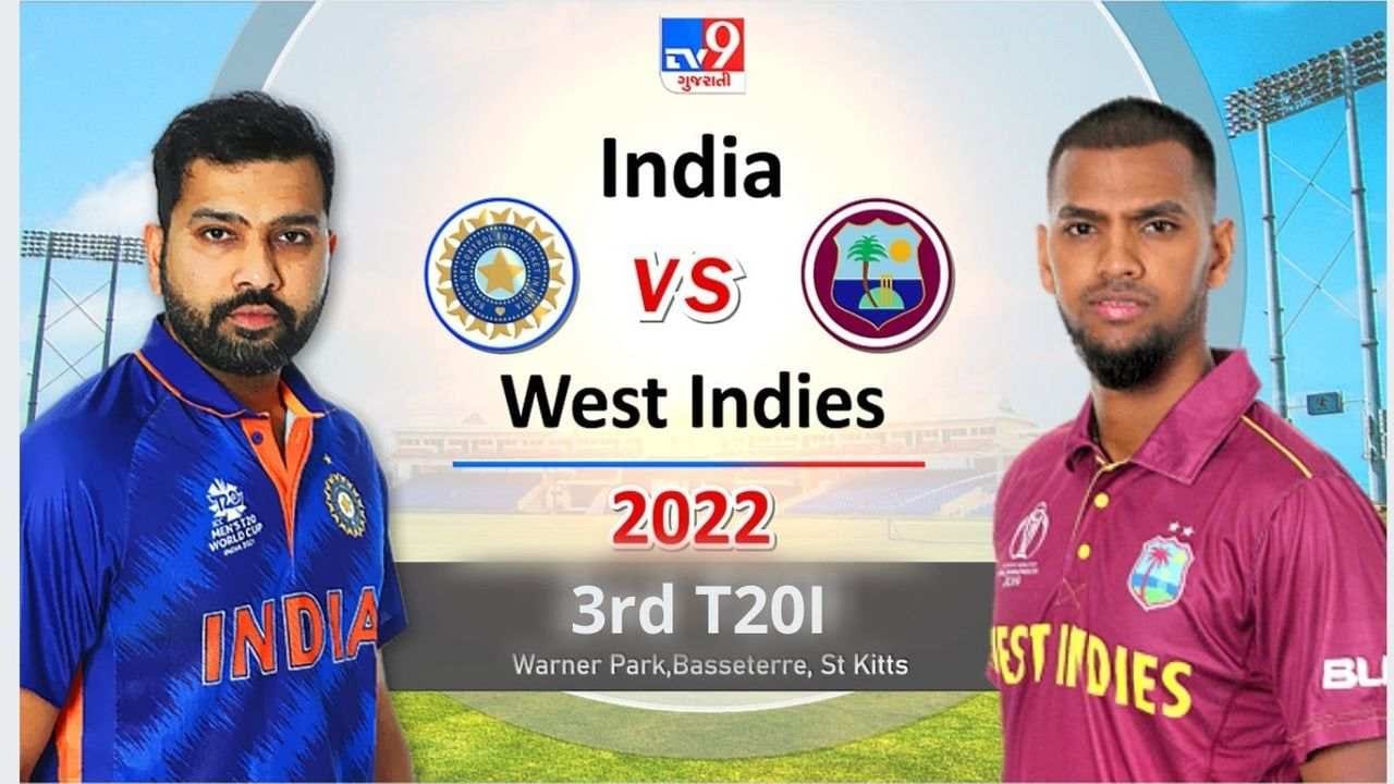 ભારત અને વેસ્ટ ઈન્ડિઝ (India vs West Indies) 24 કલાકથી ઓછા સમયમાં ફરી એકવાર ટકરાશે. બંને દેશો વચ્ચે પાંચ મેચોની ટી20 મેચની સિરીઝ રમાઈ રહી છે. જેની ત્રીજી મેચ સેન્ટ કિટ્સમાં મેચ રમાવાની છે. એક દિવસ પહેલા સોમવાર, 1 ઓગસ્ટે પાંચ મેચોની શ્રેણીની બીજી મેચમાં વેસ્ટ ઈન્ડિઝે જીત સાથે શ્રેણી 1-1થી બરાબર કરી લીધી હતી. હવે બંને પાસે લીડ લેવાનો મોકો છે. ભારતીય કેપ્ટન રોહિત શર્માએ ટોસ જીતીને પહેલા બોલિંગ કરવાનો નિર્ણય લીધો છે.