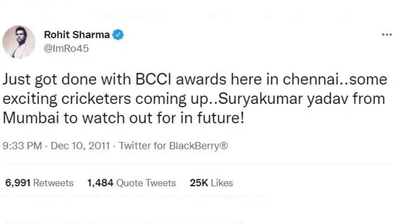 વાસ્તવમાં, આવું એટલા માટે થયું કારણ કે રોહિત શર્માનું લગભગ એક દાયકા જૂનું ટ્વીટ સોશિયલ મીડિયા પર વાયરલ થયું હતું જેમાં રોહિતે સૂર્યા વિશે કંઈક કહ્યું હતું. 10 ડિસેમ્બર, 2011 ના રોજ, રોહિત શર્માએ એક ટ્વીટ કર્યું, જેમાં તેણે લખ્યું કે મને હમણાં જ ચેન્નાઈમાં બીસીસીઆઈ એવોર્ડ્સમાંથી મુક્તિ મળી છે. ઘણા મહાન ક્રિકેટરો આવી રહ્યા છે, તેમાંથી એક છે સૂર્યકુમાર યાદવ જેના પર ભવિષ્યમાં નજર રાખવી જોઈએ.
