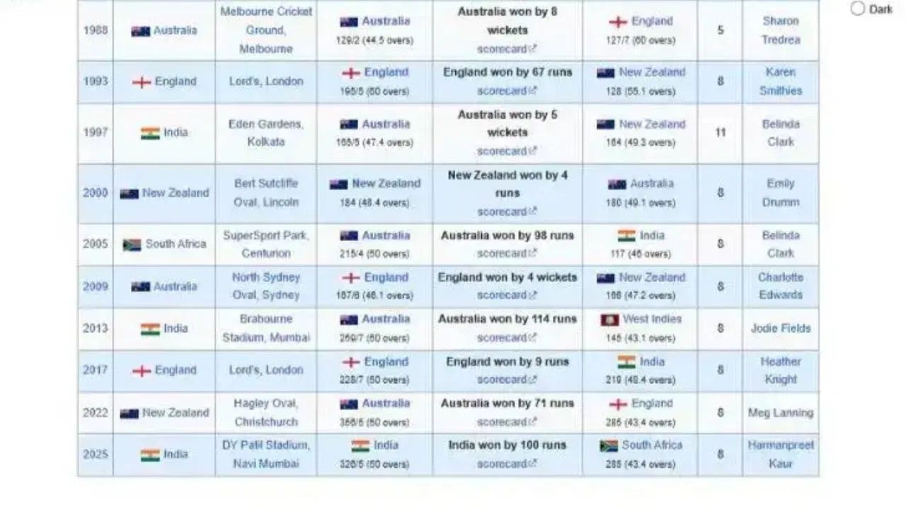 હા, આ ચોંકાવનારો દાવો મહિલા ક્રિકેટ વર્લ્ડ કપના સત્તાવાર વિકિપીડિયા પેજ પર કરવામાં આવ્યો હતો. હકીકતમાં, શનિવાર, 1 નવેમ્બરના રોજ, જ્યારે વર્લ્ડ કપની અગાઉની બધી આવૃત્તિઓના વિભાગમાં વર્તમાન ટુર્નામેન્ટની ફાઈનલનો ઉલ્લેખ કરવામાં આવ્યો હતો, ત્યારે ભારતને વિજેતા જાહેર કરવામાં આવ્યું હતું. અહેવાલ મુજબ, ભારતે ફાઈનલમાં દક્ષિણ આફ્રિકાને 100 રનથી હરાવ્યું, અને પ્રથમ વખત વર્લ્ડ કપ જીત્યો. આ અપડેટે બધાને ચોંકાવી દીધા, અને તેના સ્ક્રીનશોટ વાયરલ થયા.