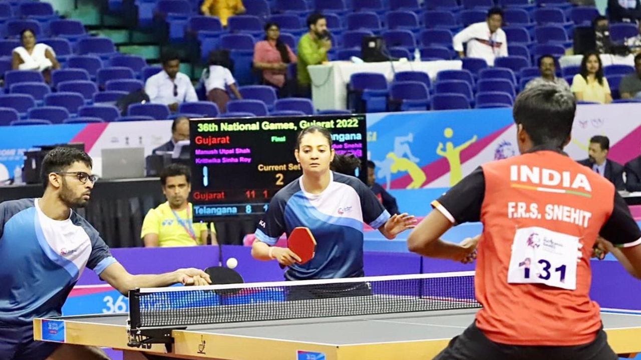 માનુષ ઉત્પલ શાહ અને કૃત્વિકા સિન્હા રોયે ટેબલ ટેનિસમાં મિક્સ્ડ ડબલ્સ ઈવેન્ટની ફાઇનલ જીતીને ગુજરાત માટે વધુ એક ગોલ્ડ જીત્યો છે. માનુષ અને કૃત્વિકાની જોડીએ ફાઇનલમાં તેલંગાણાની જોડીને 3-0 થી માત આપી હતી. ફાઇનલમાં માનુષ અને કૃત્વિકાએ તેલંગાણાની ફિડેલ અને અકુલા શ્રીજાની જોડીને 11-8, 11-5, 11-6 થી માત આપીને જીત મેળવી હતી. ગુજરાતનો ટેબલ ટેનિસમાં આ બીજો ગોલ્ડ મેડલ છે. જ્યારે માનુષનો પણ આ પ્રતિયોગિતાનો બીજો સુવર્ણ પદક છે કારણ કે પુરૂષોની ટીમ ઇવેન્ટમાં પણ તેણે ગોલ્ડ મેડલ જીત્યો હતો.