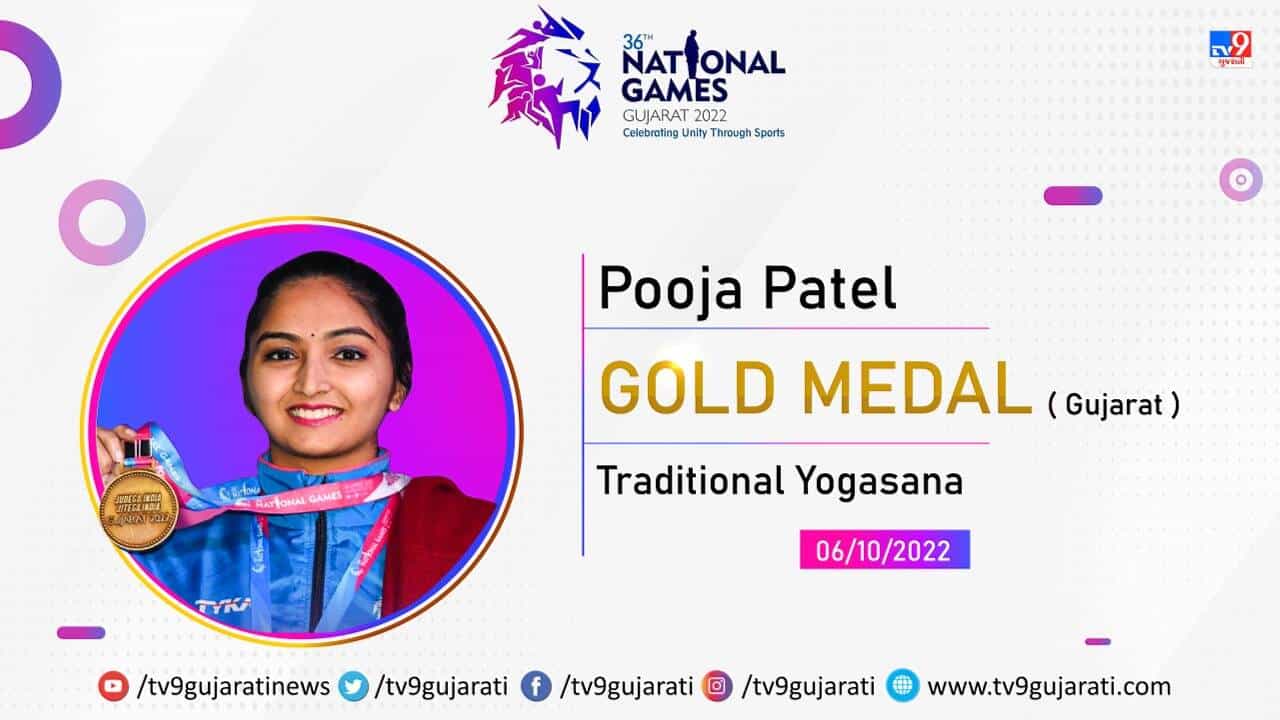 યોગાસનની રમતનો આ વર્ષે પ્રથમ વાર નેશનલ ગેમ્સમાં આયોજન થઇ રહ્યું છે. તેથી ગુજરાતની પૂજા પટેલે ગોલ્ડ મેડલ જીતીને ઇતિહાસ રચ્યો છે. ટ્રેડીશનલ યોગાસનમાં ગુજરાતની પૂજા પટેલે 62.46 નો સ્કોર કર્યો હતો અને ગોલ્ડ મેડલ જીત્યો હતો. મહારાષ્ટ્રની છકુલી બંસીલાલ સેલોકરે 62.34 ના સ્કોર સાથે સિલ્વર મેડલ જીત્યો હતો અને કર્ણાટકની નિર્મલા સુભાષ કોડીલકરે 60.58 ના સ્કોર સાથે બ્રોન્ઝ મેડલ જીત્યો હતો.