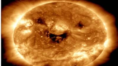 આ તસવીરોમાં તમે સૂર્યને સારી રીતે જોશો તો જોવા મળશે કે સૂર્ય હસી રહ્યો છે. નાસાના સોલર ડાયનેમિક્સ ઓબ્જર્વેટરી દ્વારા પાડવામાં આવેલ આ તસવીરોમાં તમે સૂર્યમાં 2 આંખો જોઈ શકો છો, તેની સાથે સાથે ગોળ નાક અને તેની સ્માઈલ જોઈ શકાય છે. આ ફોટો સોશિયલ મીડિયા પર ખુબ વાયરલ થયો છે.