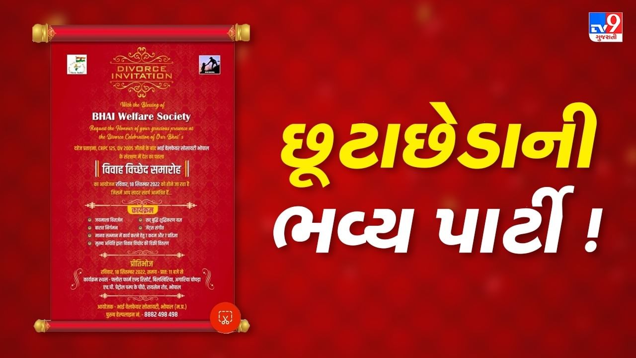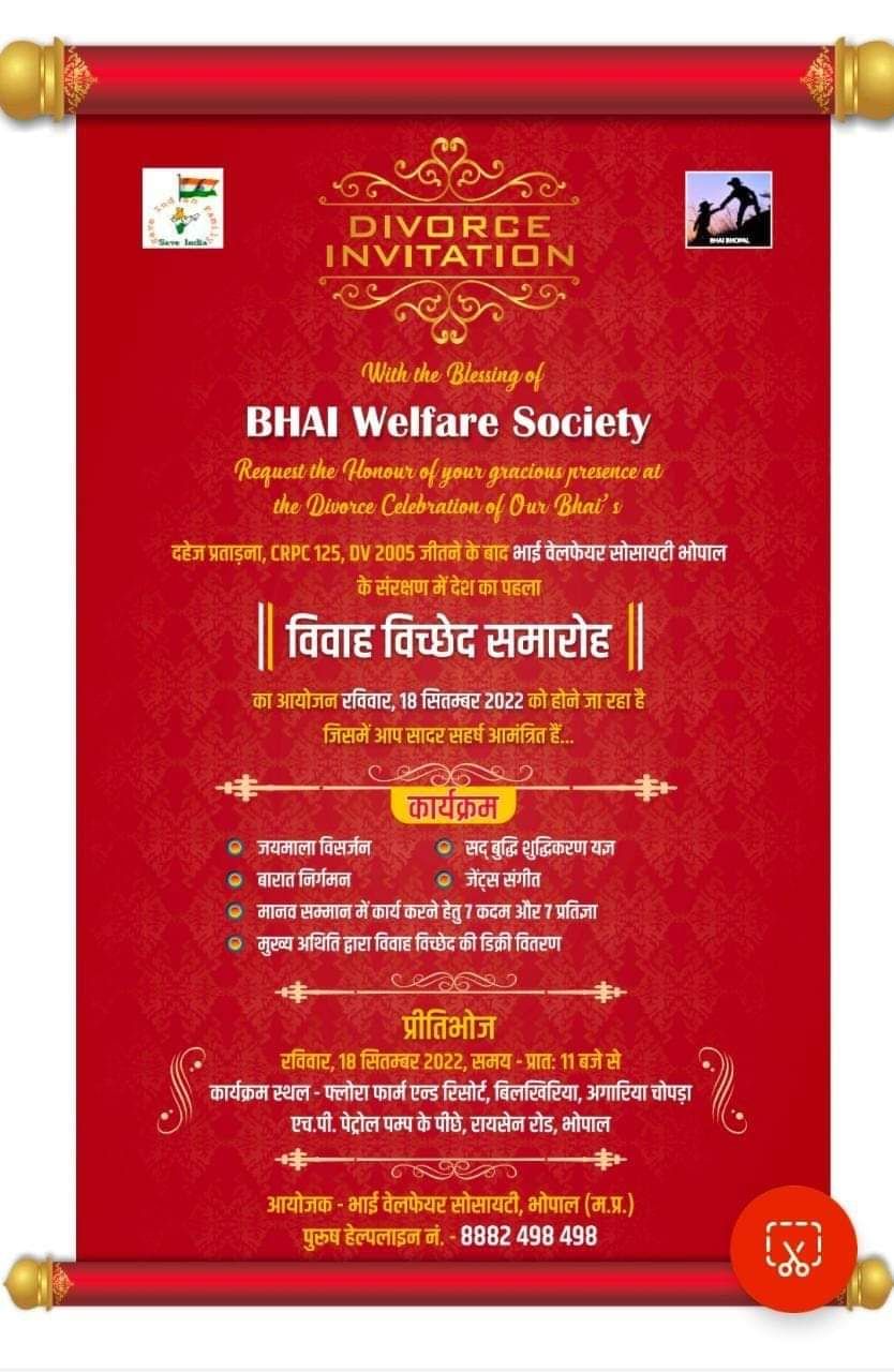 આ વાયરલ ઈનવિટેશન કાર્ડમાં લખ્યુ છે કે, દહેજ ઉત્પીડન CRPC 125 D જીત્યા પછી ભાઈ વેલફેર સોસાયટી ભોપાલના તરફથી ભારતનો પહેલો છૂટાછેડા સમાપોહમાં આપ સૌને હાર્દિક આમંત્રણ છે. આ ઈનવિટેશન કાર્ડ સોશિયલ મીડિયા પર ભારે વાયરલ થયો છે. સોશિયલ મીડિયા યુઝર આ ઈનવિટેશન કાર્ડ જોઈ પોતાની મિશ્ર પ્રતિક્રિયા આપી રહ્યા છે.