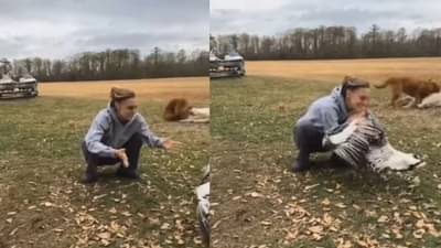સોશિયલ મીડિયાની દુનિયા’માં કઈ મજાની વસ્તુઓ જોવા જેવી છે તે કહેવું મુશ્કેલ છે. આમાંથી કેટલાક વીડિયો ફની છે તો કેટલાક એવા છે કે જેને જોયા પછી આંખો પર વિશ્વાસ કરવો મુશ્કેલ થઈ જાય છે. હવે જુઓ આ વીડિયો જે વાયરલ થઈ રહ્યો છે. વીડિયોમાં તમે જોઈ શકો છો કે એક યુવતી મેદાનમાં બેઠી છે અને તેની પાછળ બે કૂતરા રમી રહ્યાં છે. બીજી જ ક્ષણે યુવતી તેના હાથ ફેલાવે છે અને કોઈને બોલાવવાનો પ્રયાસ કરે છે.