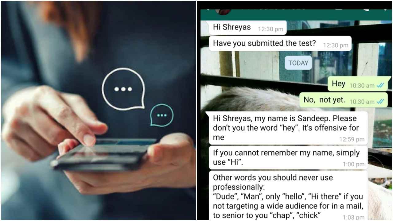 મીડિયા રિપોર્ટમાં આવેલા સમાચાર મુજબ, કર્મચારીએ તેને વોટ્સએપ પર Hey લખીને શુભેચ્છા પાઠવી તો બોસે લખ્યું, ‘હાય શ્રેયસ, મારું નામ સંદીપ છે. કૃપા કરીને ‘Hey’ શબ્દનો ઉપયોગ કરશો નહીં. આ મારા માટે અપમાનજનક છે. જો તમને મારું નામ યાદ નથી, તો ફક્ત ‘Hi’ નો ઉપયોગ કરો. તેને વધુમાં કહ્યું કે સીનિયરએ કોઈ વધુ ચોખવટ કરી નહીં કે ‘Hi’ શા માટે વધુ સારું હતું. બંને શબ્દો સેમી-પ્રોફેશનલ છે અને અંગ્રેજી ભાષામાં લગભગ સમાન શબ્દો છે.