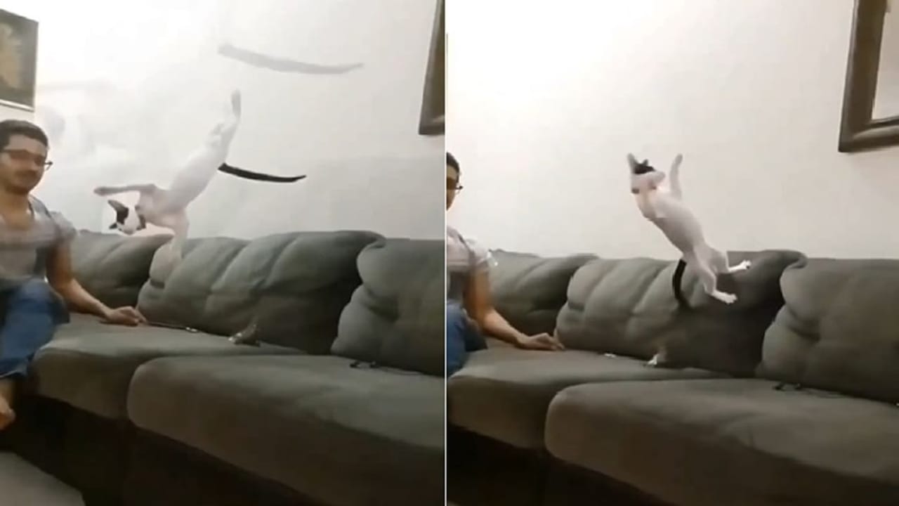 વીડિયોમાં તમે જોઈ શકો છો કે એક માણસ બિલાડીને પરાક્રમ કરવામાં મદદ કરી રહ્યો છે. બિલાડી થોડે દૂરથી દોડતી આવે છે અને સોફા પાસે પહોંચીને ઉપરની તરફ કૂદીકો મારે છે. પછી સોફા પર બેઠેલી વ્યક્તિ તેના હાથનો હળવો ઉપયોગ કરે છે અને તે પછી બિલાડીનું અનોખું પરાક્રમ જોવા મળે છે. તમે કૂતરાઓને આવું પરાક્રમ કરતાં ઘણી વાર જોયા હશે, પરંતુ તમે ભાગ્યે જ કોઈ બિલાડીને આવું કરતી જોઈ હશે. આ એક અદ્દભુત વીડિયો છે, જેને જોઈને તમે પણ આશ્ચર્યચકિત થઈ જશો.
