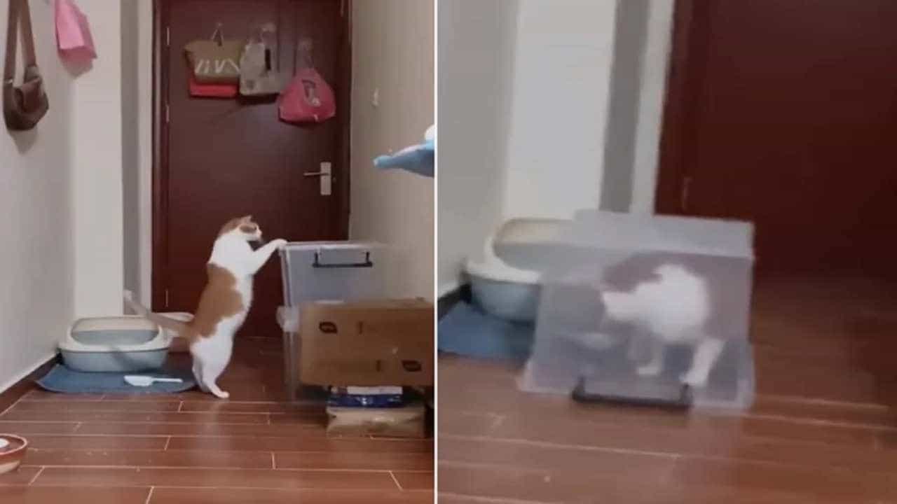ખરેખર, એક બિલાડી પ્લાસ્ટિકના મોટા ચોરસ બોક્સમાં ડોકિયું કરવાનો પ્રયાસ કરી રહી હતી અને તેમાં શું રાખવામાં આવ્યું છે તે જોવાનો પ્રયાસ કરી રહી હતી, ત્યારે જ તે બોક્સ પોતે જ નીચે પડી જાય છે અને બિલાડી તેમાં ફસાઈ જાય છે. વીડિઓમાં તમે જોઈ શકો છો કે બિલાડીની આ મસ્તી તેના પર જ ભારે પડી છે. તે બોક્સમાં જોઈ રહી હતી કે ખાવા-પીવા માટે કંઈક હોય તો મળી જાય, પણ તેને શું ખબર કે તે આ રીતે પોતાની જ જાળમાં ફસાઈ જશે. આને કહેવાય ‘પોતાના પગ પર કુહાડી મારવી’. હવે બોક્સમાં ફસાઈ ગયા પછી બિલાડી વિચારમાં પડી ગઈ કે તે કેવી રીતે બહાર આવશે? આ એક ખૂબ જ ફની વીડિયો છે, જેને જોઈને તમે હસી પડશો.