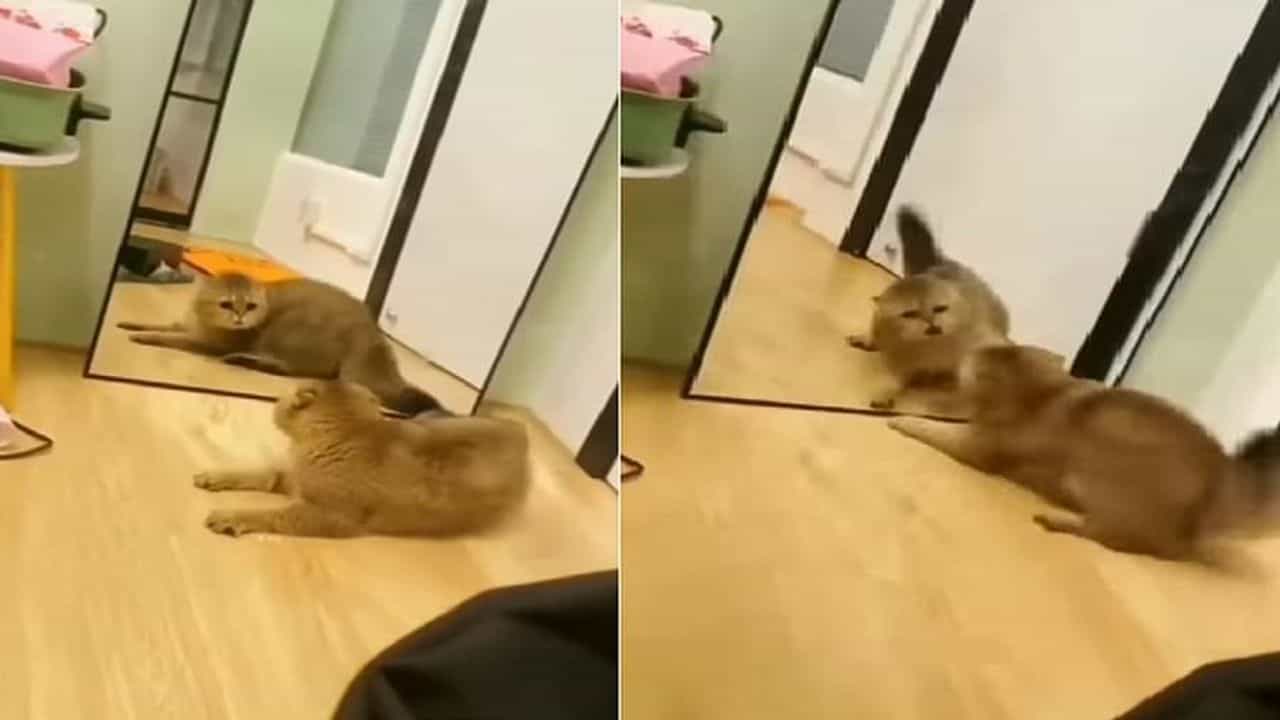 વીડિયોમાં તમે જોઈ શકો છો કે એક પાલતુ બિલાડી ઘરમાં આરામથી બેઠી છે, પરંતુ તેની નજર અરીસા પર પડતાં જ તે ભડકી જાય છે. તે વિચારે છે કે અરીસાની અંદર કોઈ બીજું પ્રાણી છે અને તેની સાથે લડવાના મૂડમાં આવી જાય છે. તે અરીસા પર જ જોરશોરથી તેના પગના પંજા મારવાનું શરૂ કરે છે. ક્યારેક તે તેના પગ અરીસાની મધ્યમાં અને ક્યારેક ખુણા પર મારે છે. હવે તેને શું ખબર કે અરીસામાં તેની પોતાની છબી છે, જેને તે અન્ય પ્રાણી સમજીને લડી રહી છે.