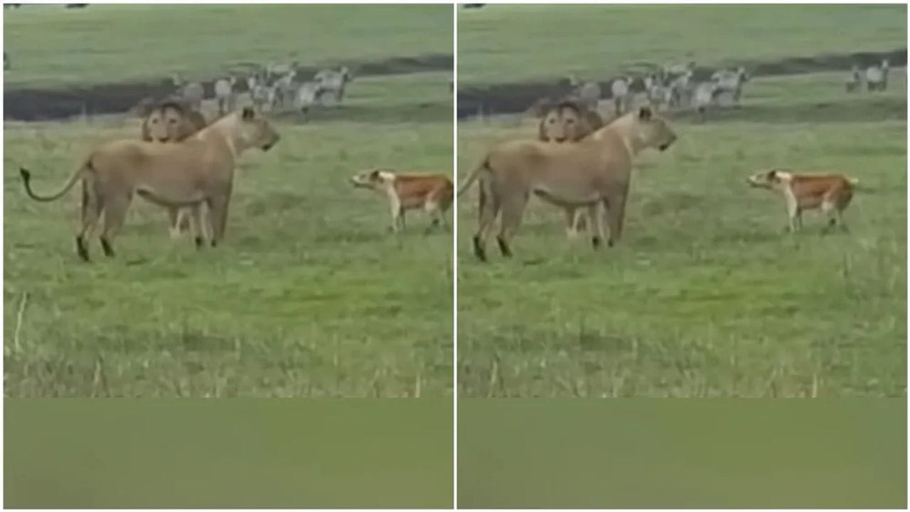 સિંહને જંગલનો (Lion) રાજા કહેવામાં આવે છે. ભલે તે વજનમાં ભારે દેખાતો હાથી હોય કે ઊંચાઈમાં ઉંચો દેખાતો જિરાફ હોય. જંગલમાં તેની હાજરીથી બધા ડરે છે. સિંહની ગર્જના (Lion viral video) સાંભળીને આખું જંગલ ધ્રૂજવા લાગે છે, પરંતુ તમે એ કહેવત તો સાંભળી જ હશે કે, કોઈ પણ યુદ્ધ જીતવું તાકાતથી નહીં પણ અંદરની હિંમતથી જીતાય છે. આ કહેવત માત્ર માણસોને જ નહીં, પ્રાણીઓને પણ લાગુ પડે છે. આ કહેવત સાથે જોડાયેલો એક વીડિયો સામે આવ્યો છે. તમે પણ તેને જોઈને દંગ રહી જશો.