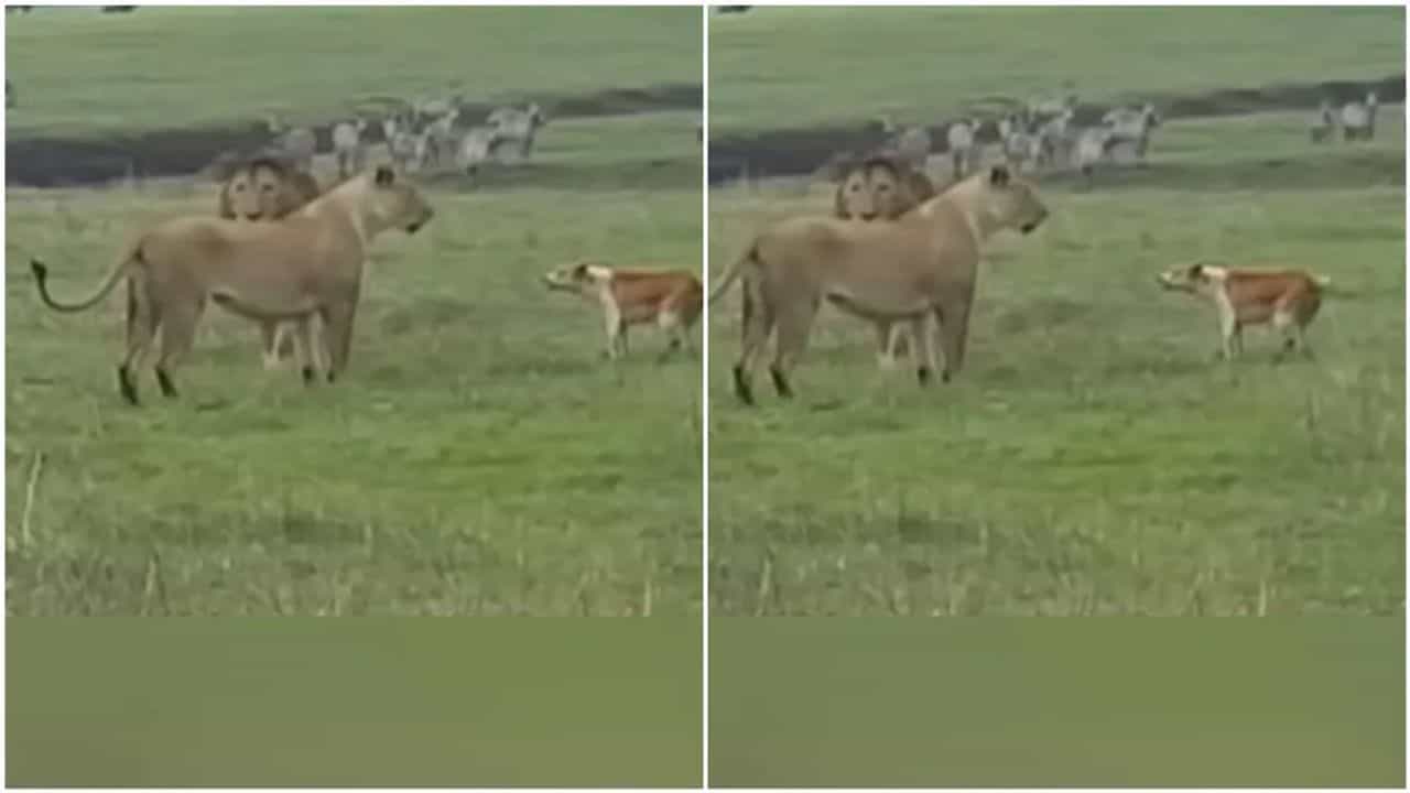 વીડિયોમાં તમે જોઈ શકો છો કે, જંગલમાં સિંહ અને સિંહણ બેઠેલા છે અને તેમનાથી થોડે દૂર ઝીબ્રાનું (Zebra) ટોળું પણ ઘાસ પર ચરી રહ્યું છે. આ દરમિયાન, એક કૂતરો આવે છે અને સિંહ-સિંહણ પર ભસવાનું શરૂ કરે છે અને પછી તેમના પર હુમલો કરવાનો પ્રયાસ કરે છે. કૂતરાને જવાબ આપવાને બદલે સિંહ અને સિંહણ પીછેહઠ કરતા જોવા મળે છે. રસપ્રદ વાત એ છે કે સિંહ અને સિંહણ કૂતરાની તમામ ક્રિયાઓને આરામથી ઝીલી રહ્યા છે. થોડીવાર ભસ્યા પછી અને એકવાર હુમલો કર્યા પછી સિંહ અને સિંહણ કૂતરા પર હુમલો નથી કરતા અને તે પાછા ફરી જાય છે.