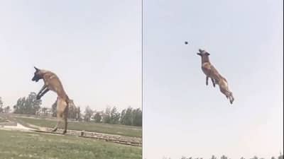વાયરલ થઈ રહેલા વીડિયોમાં તમે જોઈ શકો છો કે એક મેદાનમાં એક કૂતરા સાથે બે લોકો હાજર છે, જેમાં એક વ્યક્તિ નીચે નમીને કૂતરા માટે પ્લેટફોર્મ તૈયાર કરે છે, જ્યારે એક વ્યક્તિ હાથમાં બોલ લઈને ઉભો છે જેની રાહ જોઈ રહ્યો છે. બોલ હવામાં ઉછળે છે, અને કૂતરો નમેલી વ્યક્તિની પીઠનો ટેકો લે છે, હવામાં જબરદસ્ત કૂદકો મારીને બોલને મોંથી પકડી લે છે.