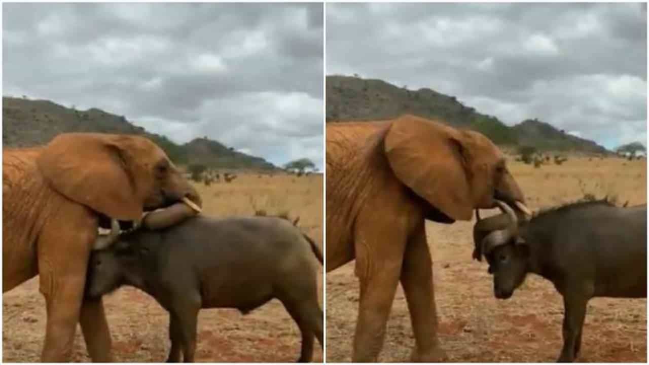 વીડિયોમાં તમે જોઈ શકો છો કે હાથી અને ભેંસ એકબીજાને પોતાના અંદાજમાં પ્રેમ કરતા જોવા મળે છે. એક તરફ જ્યાં ભેંસ હાથીને તેના શિંગડાથી ધક્કો મારી રહી છે, તો હાથી પણ તેના સૂંઢની મદદથી ભેંસને ધક્કો મારી રહી છે.