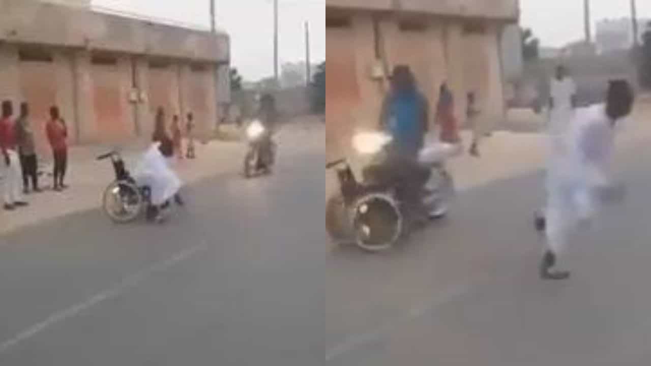 કેટલાક લોકો સમય પસાર કરવા માટે કે પછી ફેમસ થવા માટે વિચિત્ર હરકતો કરીને સોશિયલ મીડિયા પર વીડિયો અપલોડ કરતા હોય છે. આ વાયરલ વીડિયો પણ કઈક એવો છે. આ વાયરલ વીડિયોમાં એક આફ્રીકન દેશના રસ્તાનો નજારો જોવા મળી રહ્યો છે. કેટલાક લોકો કેમેરા સામે ઉભા છે તેમની સાથે એક વ્હીલચેર પર બેઠેલો વ્યક્તિ પણ છે. તે જેવો રસ્તો પસાર કરવા જાય તેવી જ સામેથી એક બાઈક ખુબ ઝડપથી આવે છે. આ બાઈકને કારણે અકસ્માતનું જોખમ જોતા જ તે વ્યક્તિ વ્હીલચેર પરથી ઊઠીને ભાગવા લાગે છે. આ મજેદાર વીડિયો સોશિયલ મીડિયા પર ખુબ વાયરલ થઈ રહ્યો છે.