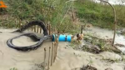 આ વીડિયોમાં, એક વિશાળ અજગર શિકાર કરવાના ચક્કરમાં શિકારીની જાળમાં ફસાઈ જાય છે, કારણ કે શિકારીએ તેને પકડવા માટે પહેલેથી જ જાળ બિછાવી દીધી છે, જેની તેને ખબર પણ નથી. આવી સ્થિતિમાં, તે શિકાર માટે આવે છે કે તરત જ તે શિકારીના ચુંગાલમાં ફસાઈ જાય છે. વીડિયોમાં તમે જોઈ શકો છો કે એક કિચડવાળા વિસ્તારમાં એક શિકારીએ અજગરનો શિકાર કરવા માટે મરઘી માટે ચારો બનાવ્યો છે. આવી સ્થિતિમાં, એક વિશાળ અજગર પાણીમાંથી પસાર થાય છે અને મરઘી પાસે જવા માટે પાઇપની અંદર પ્રવેશતા જ તે ફસાઈ જાય છે અને બહાર નીકળી શકતો નથી. તે શિકાર (ચિકન)ને પકડવા અથવા પાઇપની અંદરથી બહાર નીકળવાનો ખૂબ પ્રયાસ કરે છે, પરંતુ તે થતું નથી.