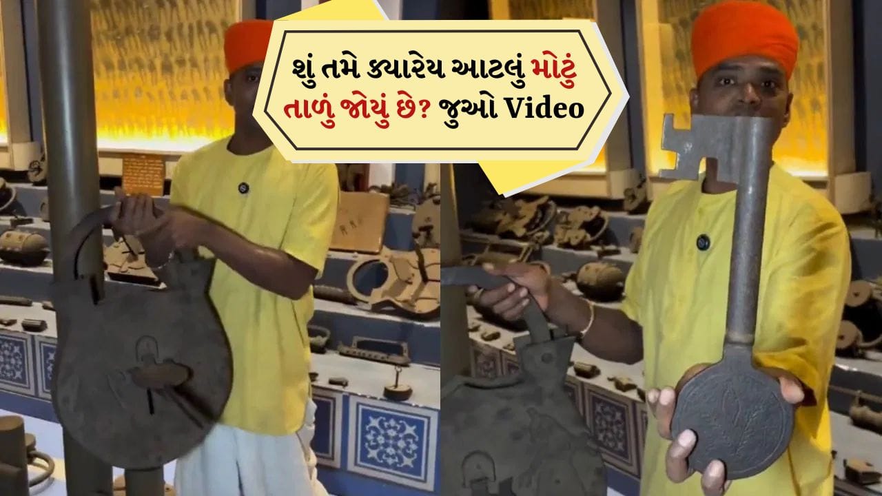 પહેલાના સમયમાં જ્યારે મોટા કિલ્લાઓ બનાવવામાં આવતા હતા, ત્યારે તેમની સુરક્ષા માટે વિશાળ દરવાજા લગાવવામાં આવતા હતા અને તે દરવાજાઓને તાળા મારવા માટે પણ વિશાળ તાળાઓનો ઉપયોગ કરવામાં આવતો હતો. જોકે તે યુગના તાળાઓ હવે ભાગ્યે જ જોવા મળે છે, પરંતુ આજકાલ સોશિયલ મીડિયા પર એક વીડિયો વાયરલ થઈ રહ્યો છે, જેમાં એક વિશાળ તાળું બતાવવામાં આવ્યું છે, જે પહેલી નજરે વિશ્વાસ કરવો મુશ્કેલ છે. સામાન્ય રીતે તાળાઓ ફક્ત નાના કદના જ દેખાય છે પરંતુ આ વીડિયોમાં બતાવેલ તાળું એટલું વિશાળ છે કે તેને ઉપાડવા માટે પણ ઘણી તાકાતની જરૂર પડે છે.