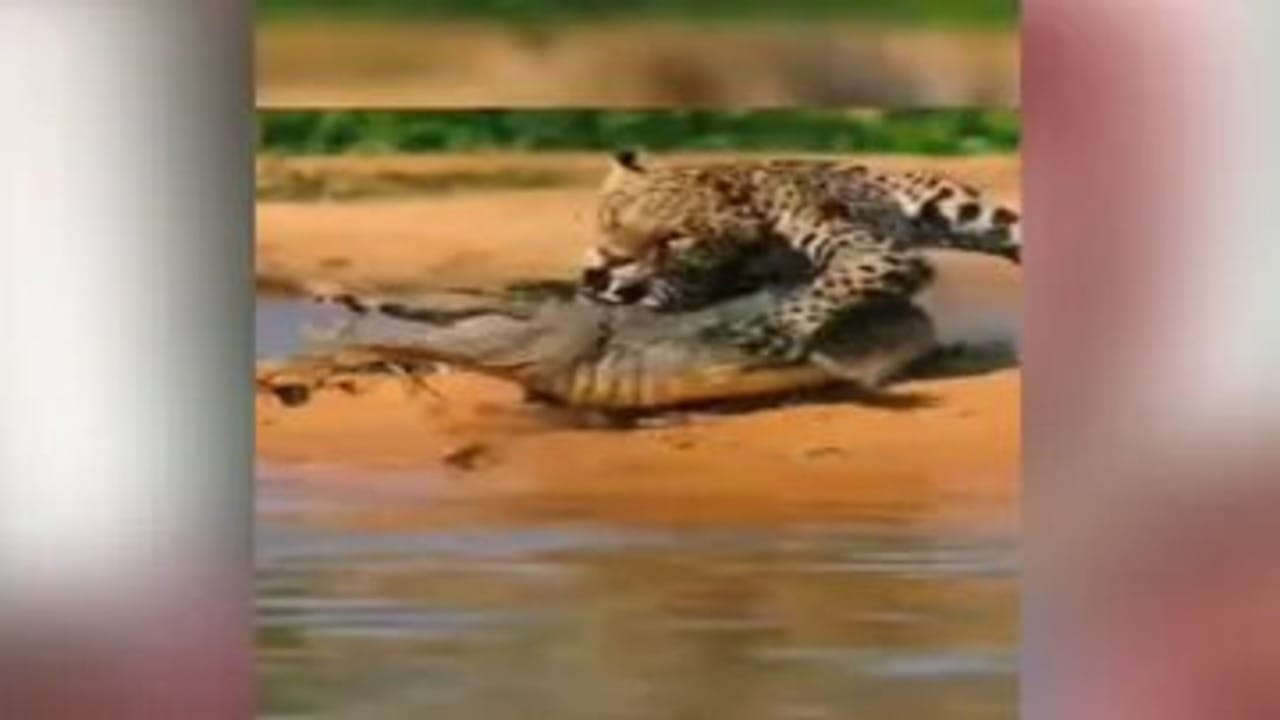 નદી કિનારે આરામ કરતા મગર પર જેગુઆરે કર્યો હુમલો, રુવાટા ઊભા કરી દેતો વીડિયો થયો વાયરલ
