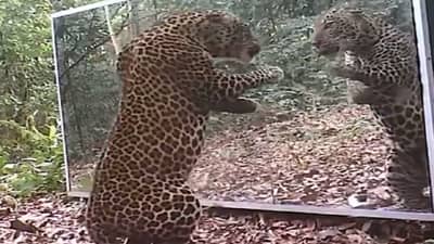 આ વીડિયો દીપડાનો (Leopard) છે. તમે આ ભયાનક જંગલી પ્રાણીને જોયા જ હશે. તેઓ શિકાર કરવામાં ખૂબ જ નિપુણ છે. તેઓ હરણ જેવા નાના પ્રાણીઓનો શિકાર કરે છે અને ક્યારેક મોટાં મગરનો પણ શિકાર કરે છે, પરંતુ જે વીડિયો વાયરલ (Viral video) થઈ રહ્યો છે તે જરા અલગ છે, કારણ કે આ વીડિયોમાં દીપડો કોઈ પ્રાણીનો શિકાર નથી, પરંતુ અરીસામાં પોતાની જાતને જુએ છે. ફની વસ્તુઓ કરતો દેખાય છે. વીડિયોમાં તમે જોઈ શકો છો કે, જંગલમાં એક મોટો અરીસો રાખવામાં આવ્યો છે, જ્યાં એક દીપડો આવે છે અને પોતાને અરીસામાં જોઈને ડરી જાય છે અને પછી ઘુરકાટ કરવા લાગે છે. ખરેખર, તેને લાગે છે કે, અરીસાની અંદર કોઈ બીજું પ્રાણી છે. હવે પ્રાણીઓને કાચનું મહત્વ શું ખબર?