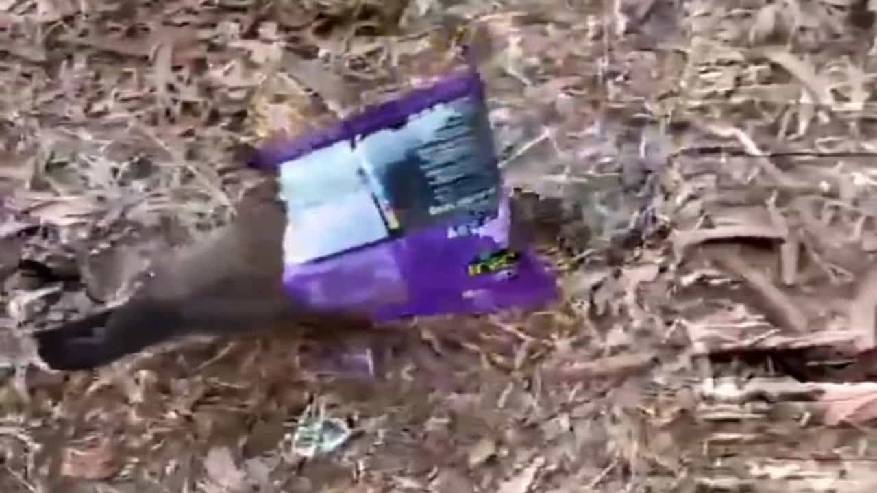A Myna bird – in a forest- trapped in a snacks packet – single use multi layer packaging (MLP ).
