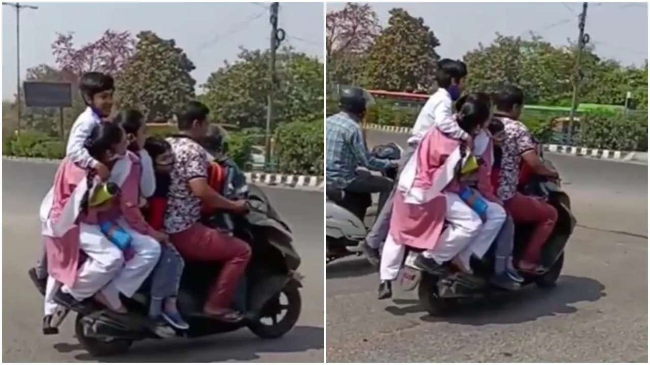 વાયરલ વીડિયોમાં તમે જોઈ શકો છો કે એક વ્યક્તિ ભીડવાળા રસ્તા પર ઘણા બાળકોને સ્કૂટી પર સ્કૂલે લઈ જઈ રહ્યો છે. આ સાથે તેણે બેગ પણ આગળ રાખી છે. સાથે જ તેણે સ્કૂટીની પાછળ પાંચ બાળકોને પણ બેસાડ્યા છે. આમાં એક બાળક ઊભું છે, તો એક છોકરી અડધી લટકેલી છે. વિચારવા જેવી વાત એ છે કે જો સંતુલન સહેજ પણ બગડી જાય તો તેનું પરિણામ બધા માટે ખતરનાક બની શકે છે.