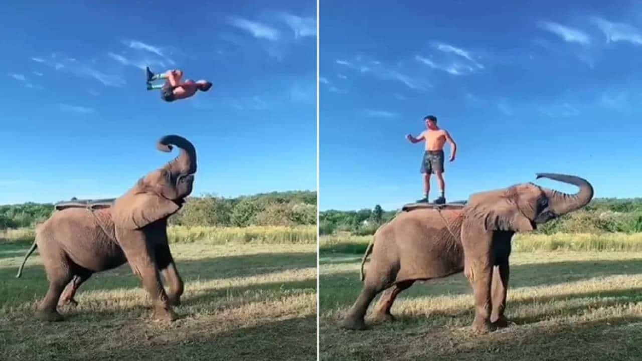 વાયરલ થઈ રહેલા આ વીડિયોમાં એક વ્યક્તિ હાથીની ટોચ પર ચડીને અદ્ભુત સ્ટંટ કરતો જોવા મળી રહ્યો છે. તમે ઘણા લોકોને બેકફ્લિપ કરતા જોયા હશે, પરંતુ શું તમે કોઈને હાથી પર બેકફ્લિપ કરતા જોયા છે? તમે કદાચ નહીં જોયો હોય, પરંતુ વાયરલ વીડિયોમાં કંઈક આવું જ જોવા મળી રહ્યું છે. વીડિયોમાં તમે જોઈ શકો છો કે એક વિશાળ હાથી આગળ થોડો નમ્યો છે અને એક માણસ દોડતો આવે છે અને તેની ઉપર ચઢીને સ્ટંટ કરવાનો પ્રયાસ કરે છે. આમાં હાથીએ પણ તેને ઘણો સાથ આપ્યો અને તે વ્યક્તિએ હવામાં બેકફ્લિપના 2-3 રાઉન્ડ માર્યા અને તે પછી હાથીની ઉપર આવી ગયો. તેનું સંતુલન અદ્ભુત છે. તે બેકફ્લિપને એટલી પરફેક્ટ રીતે કરે છે કે તે સીધો હાથી પર ઉતરે છે.