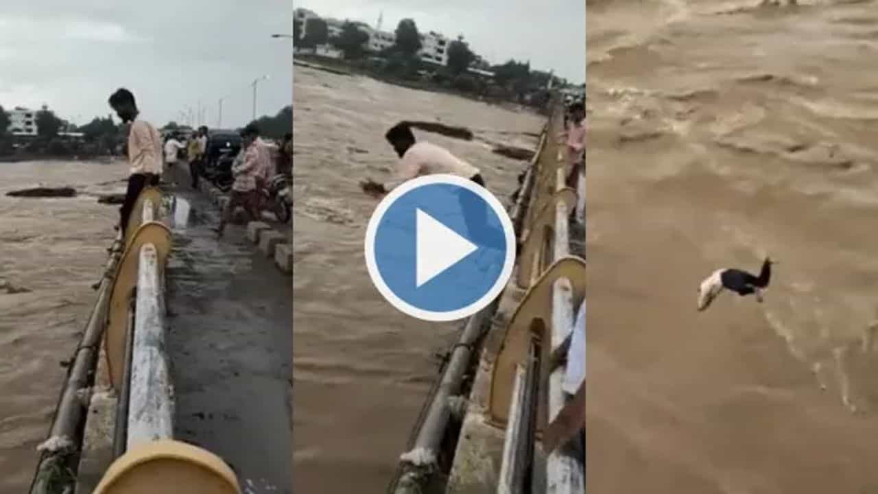 મહારાષ્ટ્ર (Maharatra)માં ભારે વરસાદ વચ્ચે પૂરની સ્થિતિ છે. ચારેબાજુ પાણી જ પાણી દેખાય છે. નદીઓ અને નાળાઓ છલકાઈ ગયા છે. રસ્તાઓ અને પુલો ઉપરથી પાણી વહી રહ્યા છે. પૂરના ઘૂઘવતા પાણીમાં કેટલાક યુવાનો તેનો વીડિયો (Video) બનાવવાની પ્રક્રિયામાં સ્ટંટ (stunt) પણ કરી રહ્યા છે. આવો જ એક વીડિયો માલેગાંવનો વાઈરલ (viral video) થઈ રહ્યો છે, જ્યાં 23 વર્ષના યુવકને પૂરના પાણીમાં નદી ઉપરથી કુદવાના ખતરનાક સ્ટંટ કરવાનુ ભારે પડ્યુ છે. બ્રિજ પરથી નઈમ અમીન નામનો યુવક પુલ પરની રેલીગ ઉપરથી નદીમાં કૂદી પડે છે, ત્યાર બાદ તેને કંઈ ખબર નથી. આ સમયે તેના મિત્રો તેનો વીડિયો બનાવી રહ્યાં હતા. નદીમાં કુદયા બાદ નઈમનો અત્તોપત્તો નથી ગુરુવારે મોડી રાત સુધી અધિકારીઓએ તેની શોધખોળ પણ કરી હતી, પરંતુ તે ક્યાંય મળ્યો નથી.