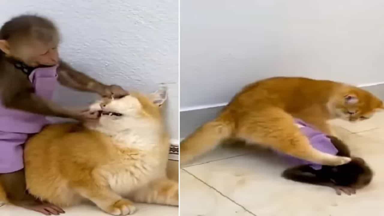 બિલાડી અને વાંદરાઓ બંને થોડા ગુસ્સાવાળા હોય છે, પરંતુ તેઓ ખૂબ તોફાની પણ હોય છે. તેની તોફાન લોકોને હસાવી હસાવીને લોટપોટ કરી દે છે. વાયરલ વીડિયોમાં પણ આવું જ દ્રશ્ય જોવા મળે છે. વીડિયોમાં તમે જોઈ શકો છો કે કેવી રીતે નાનો વાંદરો બિલાડીના દાંત ગણવાનો પ્રયાસ કરી રહ્યો છે. પછી થોડી વાર પછી બિલાડીએ તેને એવી રીતે માર્યો કે, બિચારો વાંદરો જમીન પર પડી ગયો. જો કે, બિલાડીએ તેને જાતે જ ઉપાડ્યો અને તેને ઉપાડતાની સાથે જ તેની સાથે આવી રમુજી ટીખળો કરી અને વાંદરાએ પણ તેને આ તોફાનમાં ઘણો સાથ આપ્યો. આ રમુજી વીડિયો જોયા પછી તમે ચોક્કસ હસ્યા જ હશો.