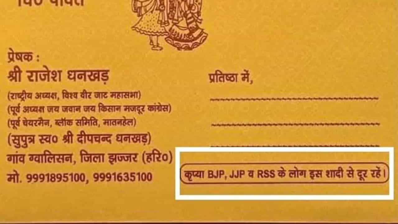 આ કંકોતરીમાં બધું બાકીની જેમ સામાન્ય છે, ફક્ત એક અનોખી લાઇન ઉમેરવામાં આવી છે જે દરેકનું ધ્યાન આકર્ષિત કરી રહી છે. લગ્નના કાર્ડ પર લખવામાં આવ્યું છે કે ભાજપ, JJP અને RSS ના લોકોએ આ લગ્નમાં આવવુ નહિ. અહેવાલો અનુસાર, આ લગ્ન કંકોતરી હરિયાણાના ઝજ્જર નિવાસી વિશ્વ વીર જાટ મહાસભાના અધ્યક્ષ રાજેશ ધનખરે છાપી છે.