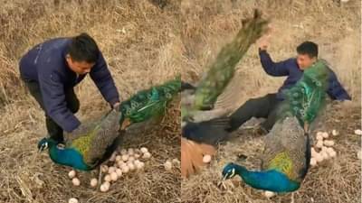 વાયરલ થઈ રહેલા વીડિયોમાં તમે જોઈ શકો છો કે એક મોર ઘણાં ઈંડાની પાસે બેઠો છે. ત્યારે જ એક વ્યક્તિ ધીમે રહીને તેની નજીક પહોંચે છે અને તેને ઊંચકીને આગળ ફેંકી દે છે. આ પછી તે જમીન પર પથરાયેલા બધા ઈંડા એકઠા કરવાનું શરૂ કરે છે. થોડીક સેકન્ડો પછી મોર ઉડતો આવે છે અને વ્યક્તિને એવી રીતે હેરામ કરે છે કે તે દૂર પડી જાય છે. તે પછી, તે તેના પર એવી રીતે હુમલો કરે છે કે તમે પણ જોઈને આશ્ચર્યચકિત થઈ જશો અને ભૂલથી પણ ક્યારેય કોઈ મોરના ઈંડાને સ્પર્શ કરવાનો પ્રયાસ કરશે નહીં.