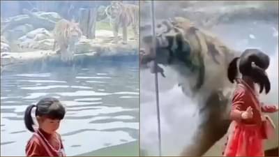 આ વીડિયો માત્ર 4 સેકન્ડનો છે, જે તમને ચોંકાવી દેશે! આપણે જોઈ શકીએ છીએ કે એક બાળક ફોટો માટે પોઝ આપી રહ્યું છે, જેને દૂર ઉભેલા વાઘ ધ્યાનપૂર્વક જોઈ રહ્યા છે. તેની અને છોકરી વચ્ચે પાણી અને કાચની દિવાલ છે. જો કે, વાઘ કાચની દિવાલની બાબતથી બેધ્યાન લાગે છે. તેથી જ તેમાંથી એક જોરશોરથી કૂદકો મારે છે અને બાળકી તરફ કૂદી પડે છે. પરંતુ તે સીધો કાચ સાથે અથડાય છે અને પાણીમાં પડી જાય છે. પરંતુ આ સમગ્ર ઘટનાથી બાળકી ડરી જાય છે અને તેના સંબંધીઓ પાસે ભાગી જાય છે.