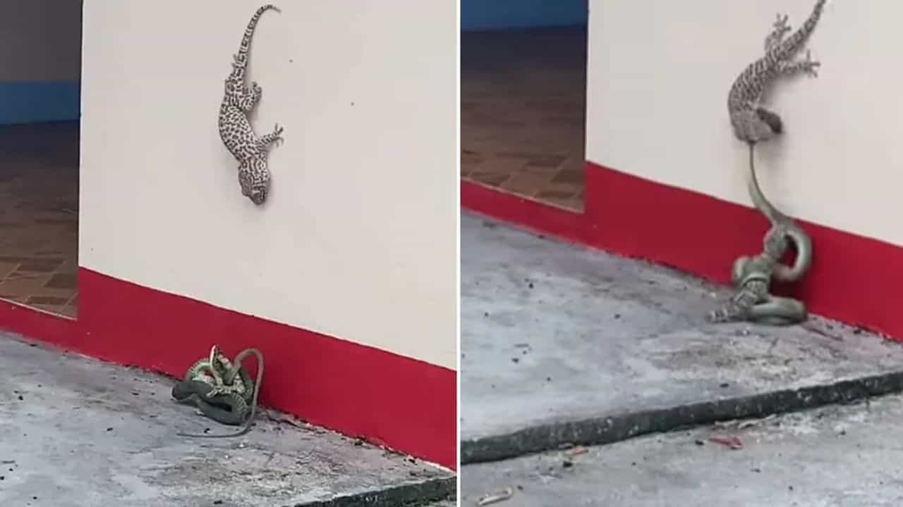 વાયરલ થઈ રહેલા વીડિયોમાં (Viral Video) જોઈ શકાય છે કે એક સાપ ઘરની બહાર દિવાલ પર સરકતી ગરોળી પર હુમલો કરે છે. આ પછી તેના પોતાના શરીર સાથે ચોંટી જાય છે. પરંતુ બીજી જ ક્ષણે જે દ્રશ્ય આવે છે તે તેનાથી પણ વધુ ચોંકાવનારું છે. મિત્રને મુશ્કેલીમાં જોઈને સાથી ગરોળી સાપ પર હુમલો કરે છે. તમે જોઈ શકો છો કે ગરોળી સાપને મોંથી દબાવીને તેને મારવાનો પ્રયાસ કરે છે. પરંતુ સાપ તે ગરોળીને ખાવાનો પ્રયાસ કરી તેને ભગાડી દે છે. જો કે, ગરોળી તેના સાથીનો જીવ બચાવવામાં સફળ રહે છે કે કેમ તે વીડિયો પરથી જાણી શકાયું નથી. પરંતુ વીડિયોમાં ગરોળી જે પણ કરે છે, તે કોઈ રિયલ હીરોથી ઓછી નથી. તો ચાલો જોઈએ આ વિડિયો.