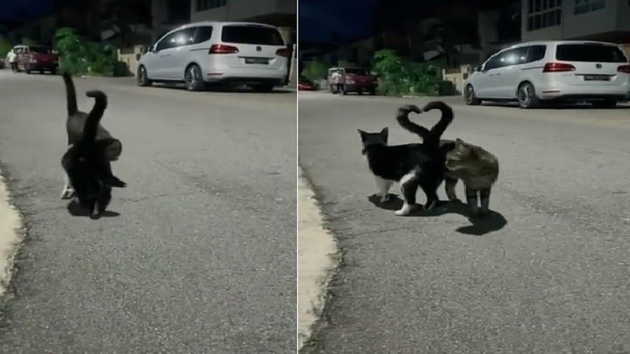 વીડિયોમાં તમે જોઈ શકો છો કે રાતનો સમય છે અને રસ્તામાં બે બિલાડીઓ સામસામે આવે છે અને એક જગ્યાએ રોકાય છે અને તેમની પૂંછડીઓ એવી રીતે જોડે છે કે હાર્ટનો આકાર બને છે. જો કે તેઓ ભાગ્યે જ જાણતી હશે કે આમ કરવાથી તેઓ કેટલી સુંદર જોવા મળી હતી. આ વીડિયો લોકોના દિલ જીતી રહ્યો છે.
