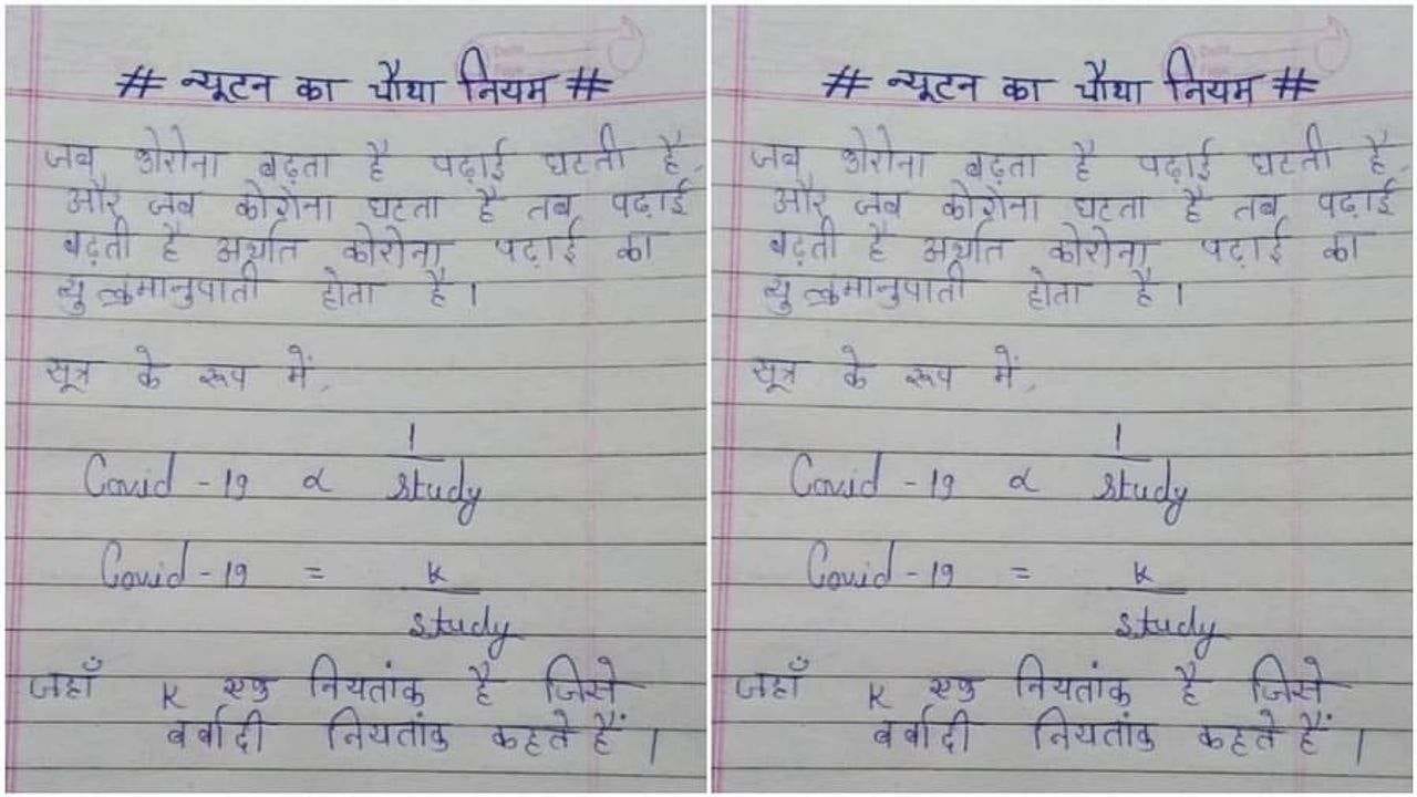 વાયરલ થઈ રહેલી તસવીરમાં તમે જોઈ શકો છો છે. કોવિડને કેન્દ્રમાં રાખીને આ બાળકે ન્યૂટનના ચોથા નિયમ વિશે લખ્યું છે કે, ‘જ્યારે કોરોના વધે છે ત્યારે શિક્ષણ ઘટે છે અને જ્યારે કોરોના ઘટે છે ત્યારે શિક્ષણ વધે છે. એટલે કે, કોરોના અભ્યાસના વિપરિત પ્રમાણસર છે. બાળકે તેને સરળ સૂત્રના રૂપમાં પણ સમજાવ્યું છે.’