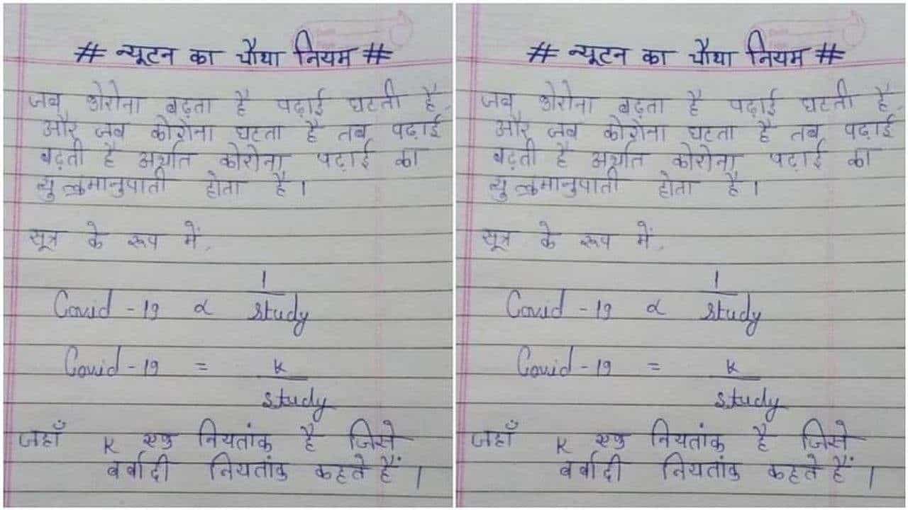 વાયરલ થઈ રહેલી તસવીરમાં તમે જોઈ શકો છો છે. કોવિડને કેન્દ્રમાં રાખીને આ બાળકે ન્યૂટનના ચોથા નિયમ વિશે લખ્યું છે કે, ‘જ્યારે કોરોના વધે છે ત્યારે શિક્ષણ ઘટે છે અને જ્યારે કોરોના ઘટે છે ત્યારે શિક્ષણ વધે છે. એટલે કે, કોરોના અભ્યાસના વિપરિત પ્રમાણસર છે. બાળકે તેને સરળ સૂત્રના રૂપમાં પણ સમજાવ્યું છે.’