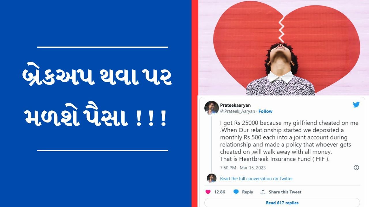 સોશિયલ મીડિયા પર હાલમાં પ્રતિક આર્યન નામના એક યુવકની ટ્વિટ ભારે વાયરલ થઈ રહી છે. જેને કારણે સોશિયલ મીડિયા પર હાલમાં હાર્ટબ્રેક ઈન્સ્યોરન્સ ફંડની ચર્ચા ભારે થઈ રહી છે. નવી પેઢીમાં આ હાર્ટબ્રેક ઈન્સ્યોરન્સ ફંડ વિશે જાણાવાની જિજ્ઞાસા વધી છે. જે લોકો હાલમાં લગ્ન પહેલા કોઈ સંબંધમાં હોય જેમ કે ગર્લફ્રેન્ડ-બોયફ્રેન્ડ કે લિવ ઈન રિલેશનશિપ, તેમણે આ સમાચાર ખાસ વાંચવા જોઈએ. બ્રેકઅપ સંબંધિત આ ટ્વિટ સોશિયલ મીડિયા પર ભારે વાયરલ થઈ રહી છે.