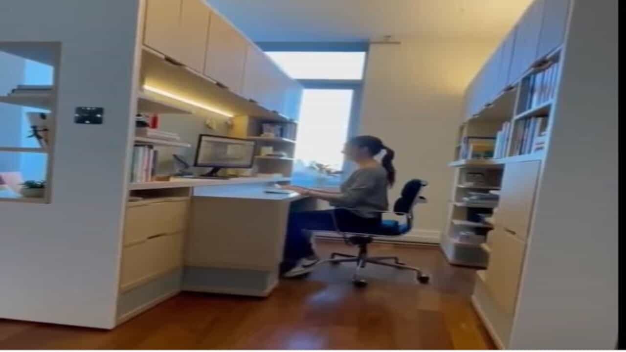 આ વીડિયોમાં જોવા મળે છે કે એખ સરસ મજાનું કેબિનેટ છે જ્યાં એક મહિલા આવે છે આ કેબિનેટ ખસે છે અને સરસ જગ્યા થઈ જાય છે તેમાંથી એ મહિલા એક ટેબલ ખેંચે છે આ એવું ટેબલ છે જેમાં જગ્યા ઓફિસમાં ફેરવાઈ જાય છે અને ત્યાર બાદ આ કેબિનેટને આગળથી બતાવવામાં આવે છે જેમાં આગલ ટીવી તેમજ પુસ્તકો વેગેરે મૂકવામાં આવ્યા છે.