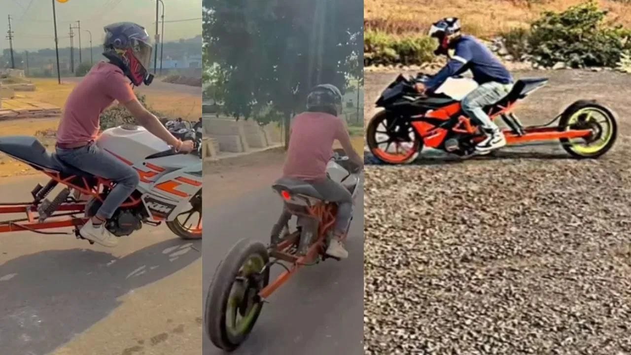 આ વીડિયોમાં તમે જોઈ શકો છો કે એક વ્યક્તિએ પોતાની ક્રિએટિવિટી બતાવવા માટે તેની ખૂબ જ સારી બાઇકને સ્ક્રેપ કરી છે. વીડિયોમાં તે વ્યક્તિ રોડ પર KTM બાઇક ચલાવી રહ્યો છે. આ વ્યક્તિએ બાઇકનું પાછળનું ટાયર કાઢીને ત્યાં સળિયો જોડી દીધો છે. તેમજ તેણે ત્યાં ટાયર મુક્યું હતુ. બાઇકને મોટી બનાવવા માટે આ વ્યક્તિએ બાઇકની ચેઇન પણ લાંબી કરી દીધી છે. આ જોયા પછી લોકો સમજી શકતા નથી કે તેણે આવું કેમ કર્યું.