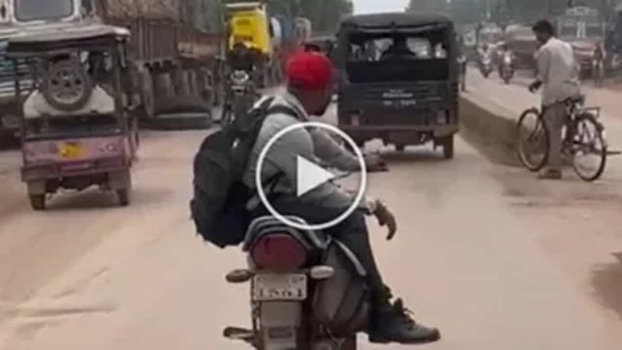 વાયરલ વીડિયોમાં તમે જોઈ શકો છો કે , એક બાઈકચાલક ખોટી રીતે બેસીને રસ્તા પર બાઈક ચલાવી રહ્યો છે. તે બાઈક પર પાછળ જે સ્ટાઈલ માં મહિલાઓ બેસતી હોય છે તે સ્ટાઈલમાં બેસીને બાઈક ચલાવી રહ્યો છે. તે એક હાથે જ બાઈકને નિયંત્રિત કરી રહ્યો છે. તે એક જાતનો સ્ટંટ કરી રહ્યો છે, જે તેના માટે અને બીજા માટે જોખમકારક છે. ખાડાવાળા રસ્તા પર પણ તે આ સ્ટંટ કરી રહ્યો છે. ટૂંકમાં તે લોકોનું ધ્યાન ખેંચવા આવા વિચિત્ર કામ કરી રહ્યો છે. તેનો આ વીડિયો વાયરલ થતા. પોલીસ એકશન મોડમાં આવી અને ટ્રાફિક નિયમો તોડવા બદલ તેને પકડીને દંડ ફટકાર્યો. સાથે સાથે ભૂલ બદલ કાન પણ પકડાવ્યા.