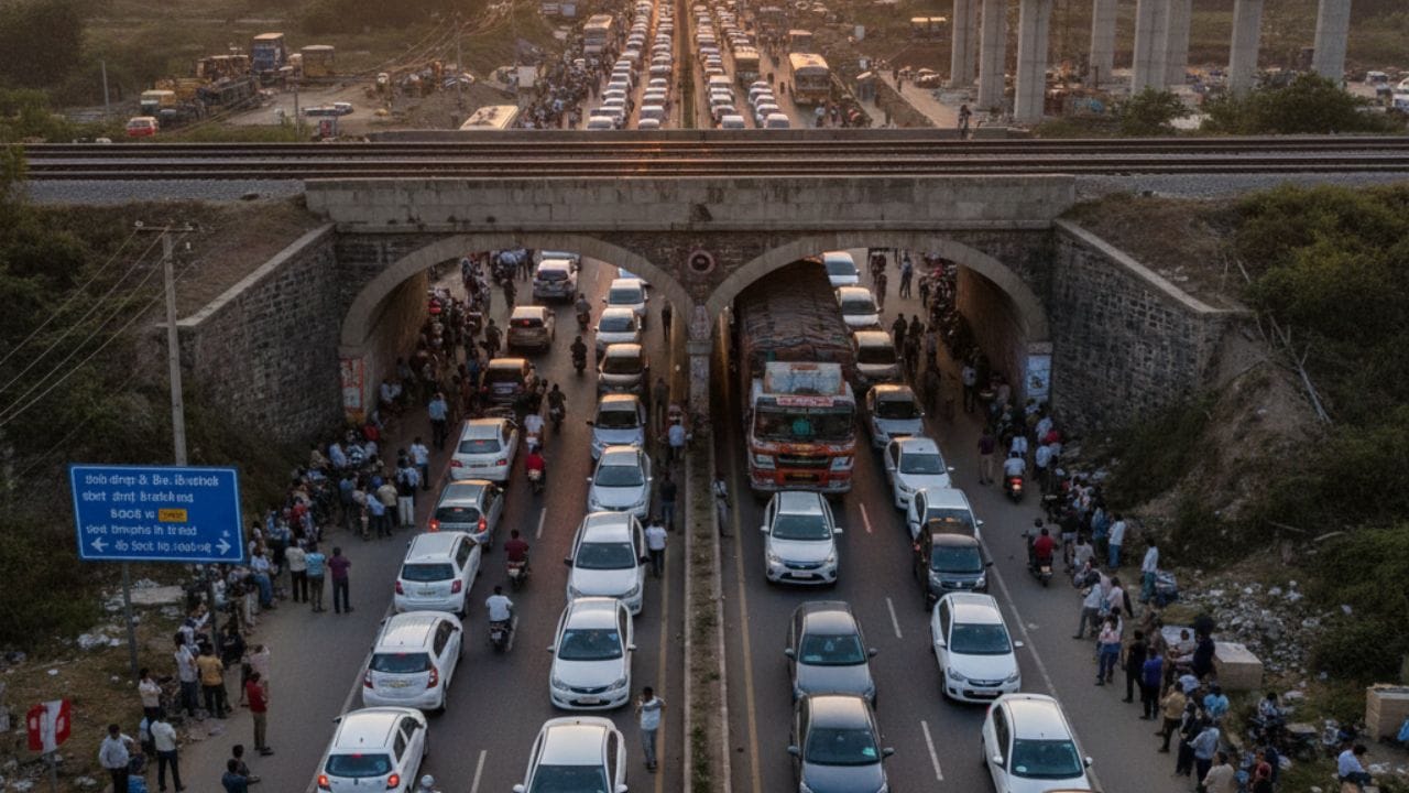 ગરનાળા નીચે ટ્રક ફસાતા ટ્રાફિક જામ સર્જાયો; રોડ પર ઓવરબ્રિજનું કામ ચાલી રહ્યું હોવાથી વાહનોને રેલ્વેના આ ગરનાળા નીચેથી ડાયવર્ઝન લઈને પસાર થવું પડતું હતું. જોકે, ટ્રક ચાલકે ગરનાળાની ઊંચાઈનો અંદાજ ન હોવાથી ટ્રક અંદર પસાર થવા જતા ફસાઈ ગયો હતો.